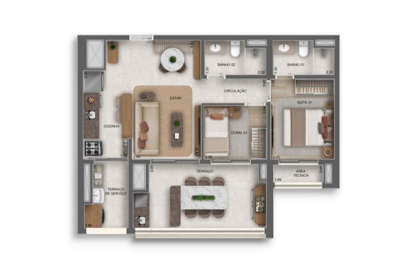 Apartamento 68m² · 2 dorms (1 Suíte)